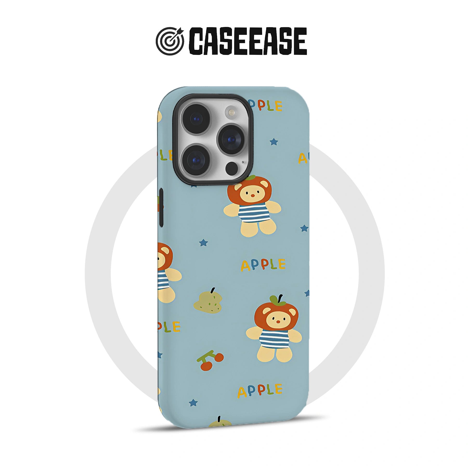 Dale un toque divertido y alegre a tu teléfono con la funda Apple Bear. Con adorables osos de dibujos animados vestidos con disfraces de manzana, coloridas ilustraciones de frutas como cerezas y peras, y el divertido texto "APPLE", esta funda le da un toque original a tus objetos de uso diario.