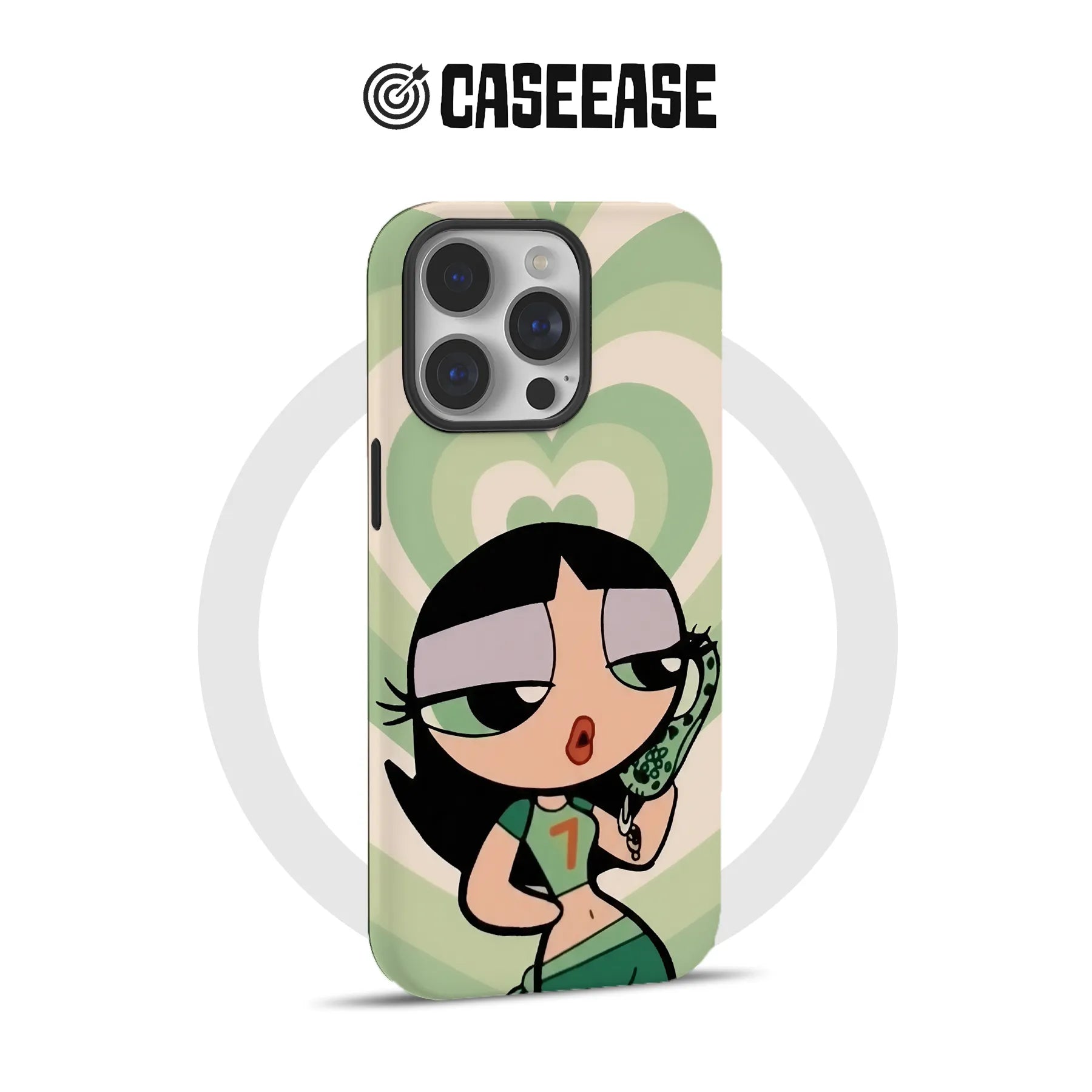 Embrace your playful side with the Cartoon-Inspired Green Hearts Phone Case. This vibrant design showcases a stylish cartoon character amid a captivating green heart pattern, bringing a fun twist to your smartphone accessories.