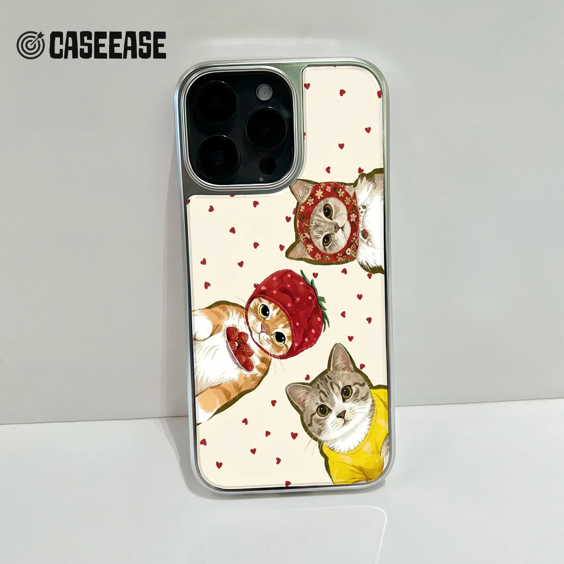 Embrace your love for cats with the Holographic Chrome Cat Phone Case. This charming design features adorable kitties dressed in playful costumes surrounded by hearts, bringing a whimsical touch to your everyday life.