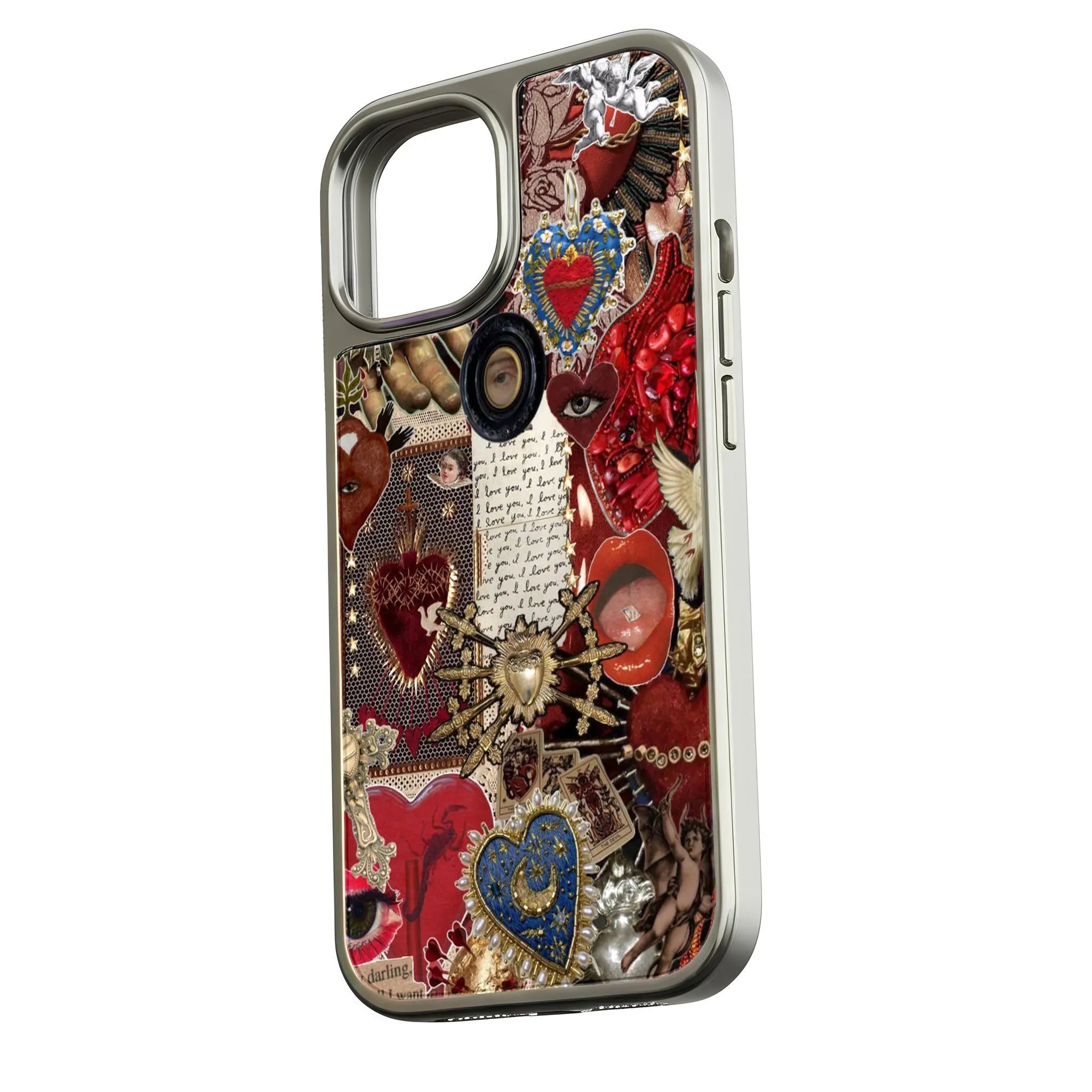 Embrace the beauty of love with our Holographic Chrome Phone Case featuring a vibrant heart collage design. This unique case combines a spectrum of colors and intricate illustrations, perfect for those who celebrate passion and creativity.