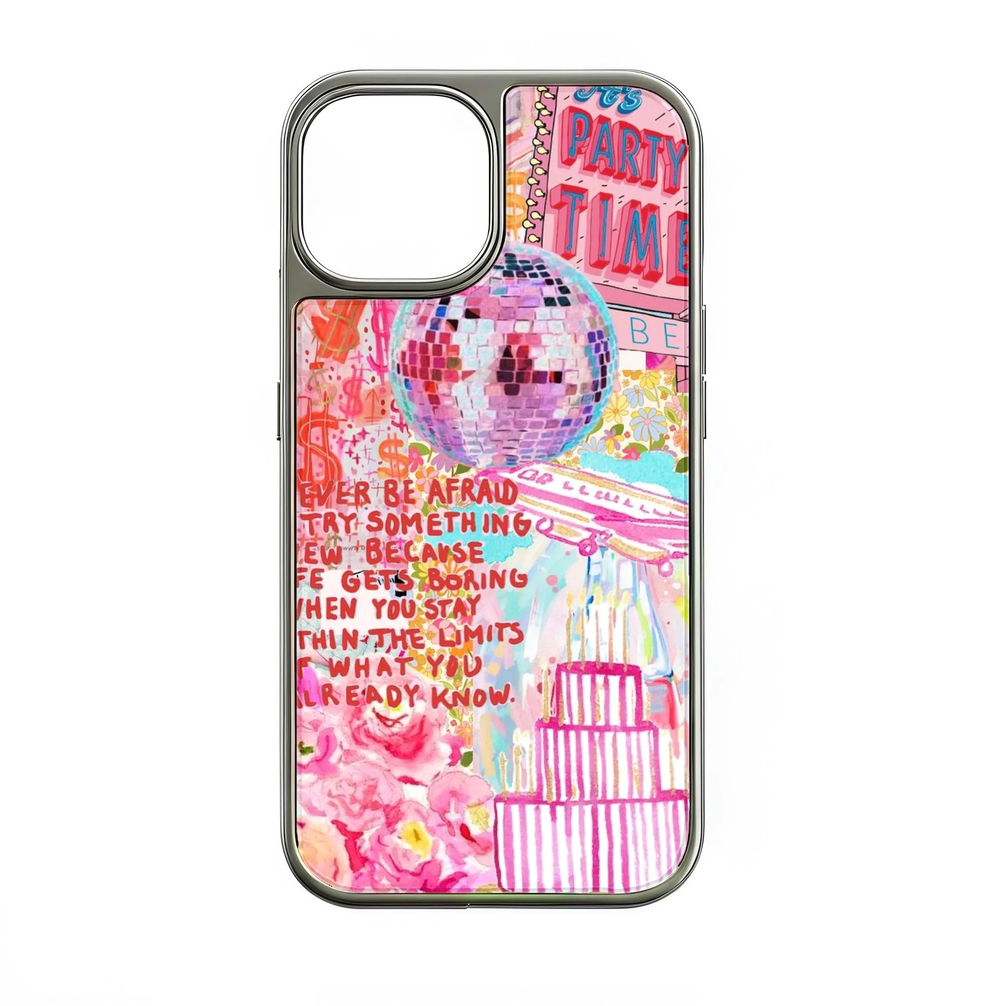 Get ready to shine with our Holographic Chrome Party Time Phone Case! This vibrant design features a cheerful disco ball, playful pinks, and motivational quotes that inspire you to embrace life’s adventures. Bring a festive touch to your mobile device with this dynamic case!