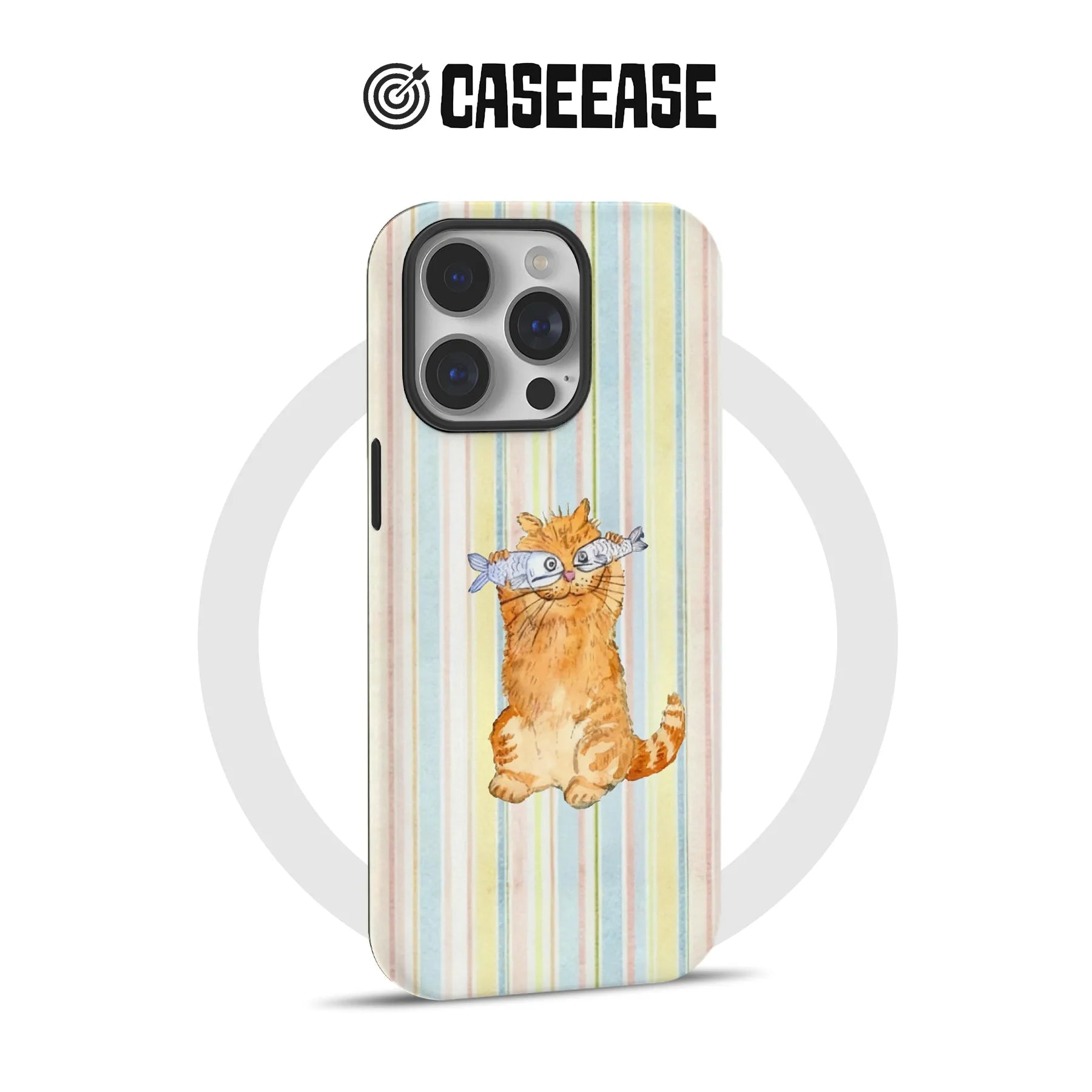 The soft pastel striped background adds a touch of whimsy, complementing the vivid colors of the cat and fish. Made from sturdy and lightweight materials, this phone case not only protects your device but also expresses your unique personality.