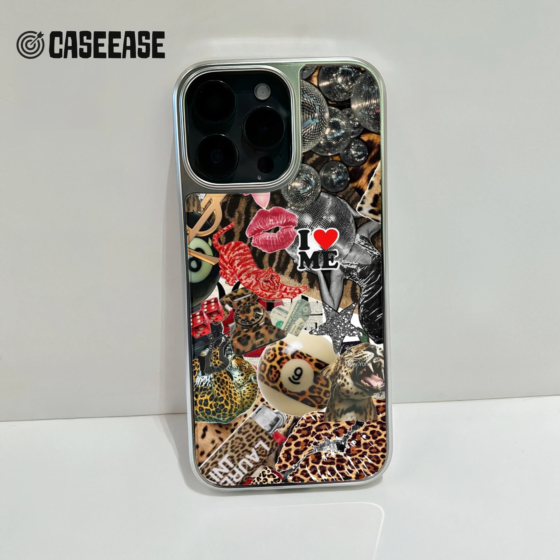 Unleash your bold side with our Holographic Chrome Phone Case that features a captivating collage of glamour and wild motifs. With vibrant illustrations including leopard prints, playful kisses, and glamorous facades, this phone case is a statement piece that speaks to your unique personality.