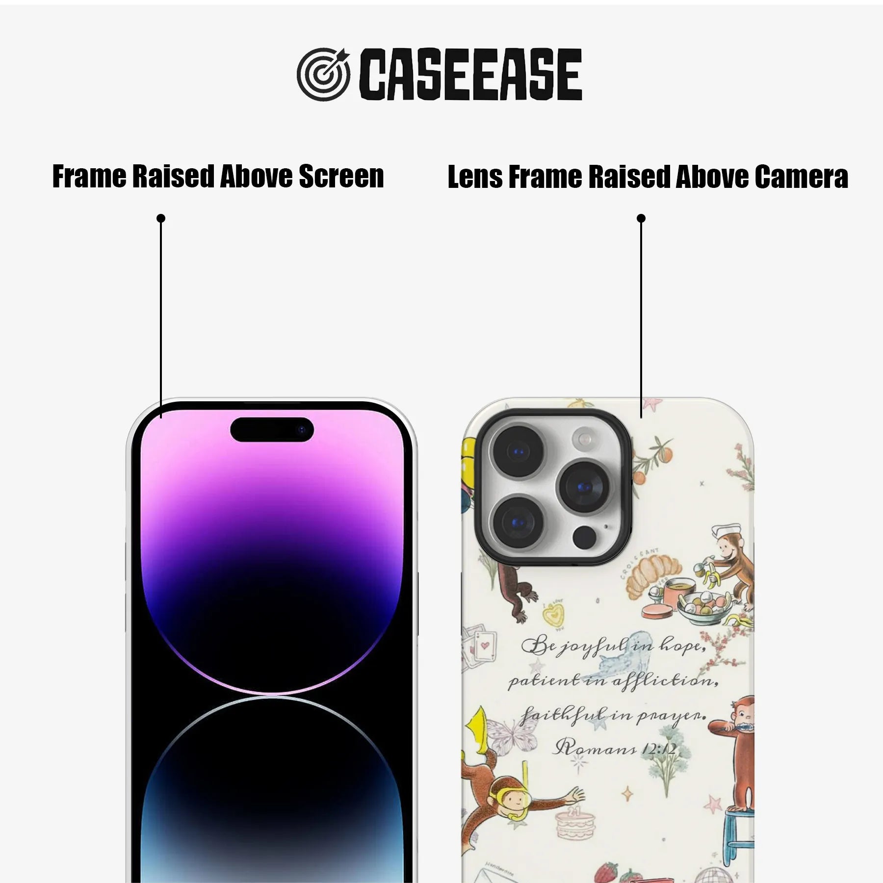 Embrace a playful spirit with the Joyful Hope Curious George Phone Case. This charming design features adorable monkeys engaged in delightful activities, accompanied by an uplifting quote from Romans 12:12, which encourages joy, patience, and faith. Bright and colorful illustrations combine with a light background to create a cheerful and inspiring look.