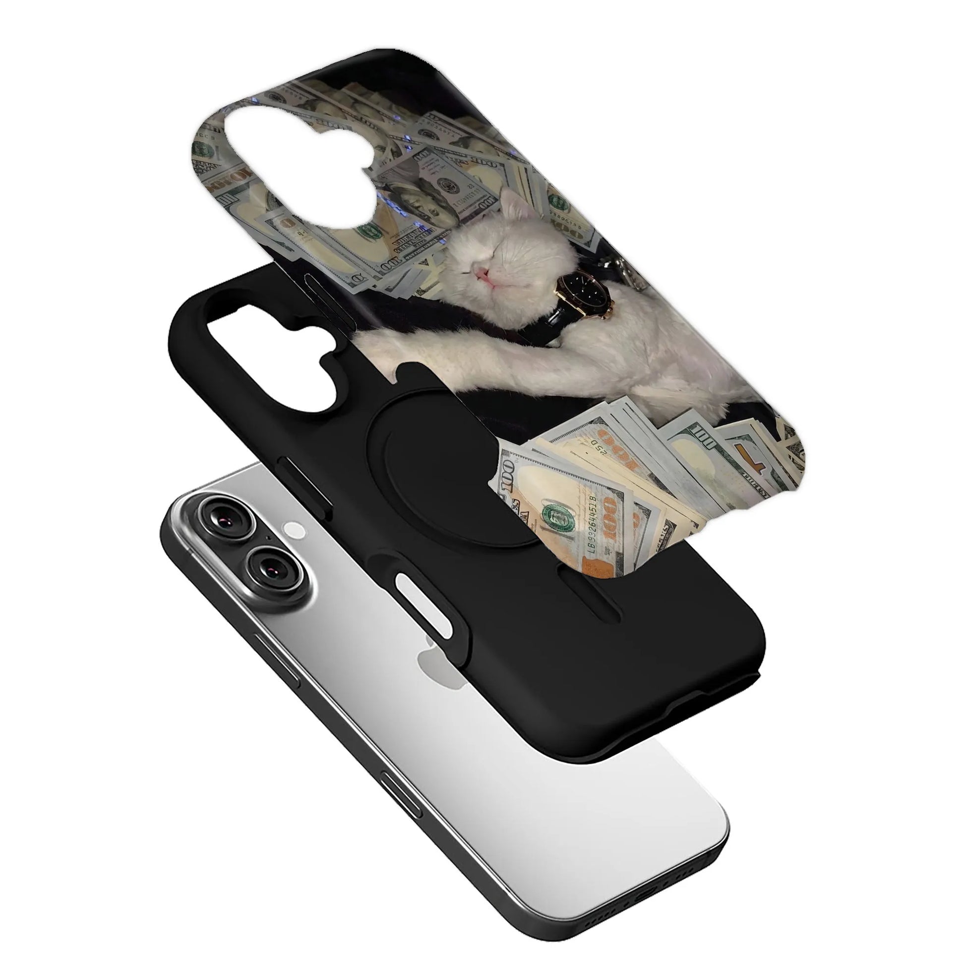 The Luxury Cat Phone Case 2025 showcases an extravagant design featuring a regal white cat surrounded by stacks of cash and adorned with a sleek black watch. Perfect for those who love bold and opulent aesthetics, this case adds a luxurious vibe to your device. Made from high-quality materials, it offers superior protection against scratches and minor drops while maintaining a slim and sleek profile. A unique accessory for personal use or as a gift, this case speaks volumes about your love for cats and high-end style.